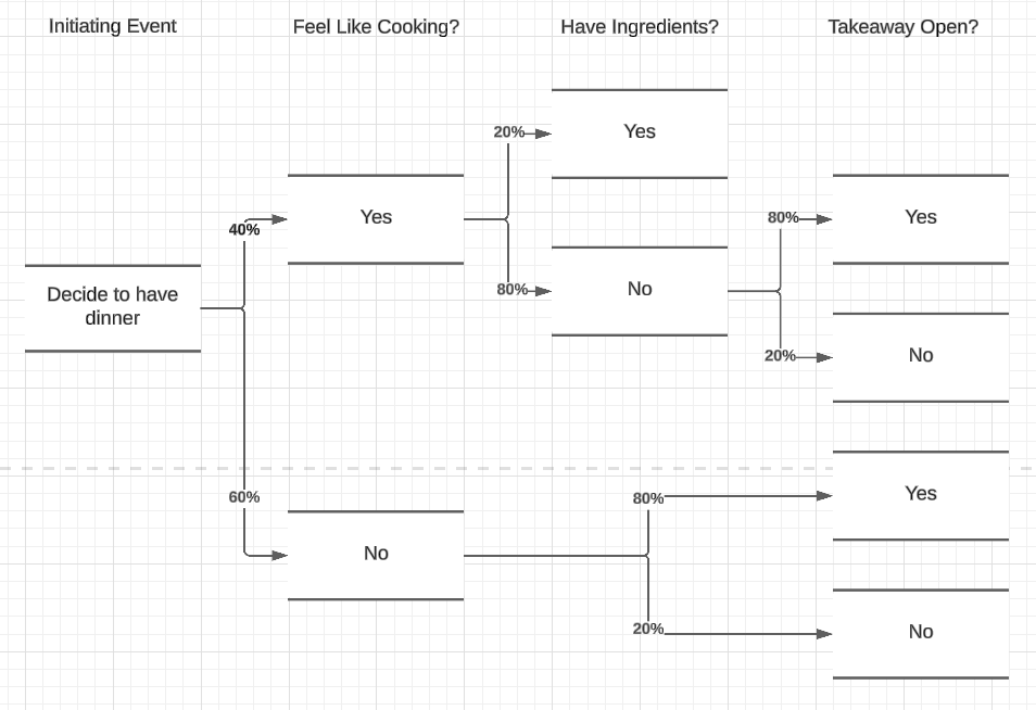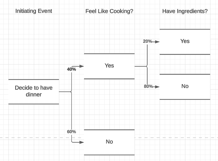 As you run through an event tree, some questions will only be relevant to certain branches. In these cases you can ignore those questions for non-relevant branches. As you can see, if I don't feel like cooking it's not relevant whether there are ingredients, because we're probably going for a takeaway.