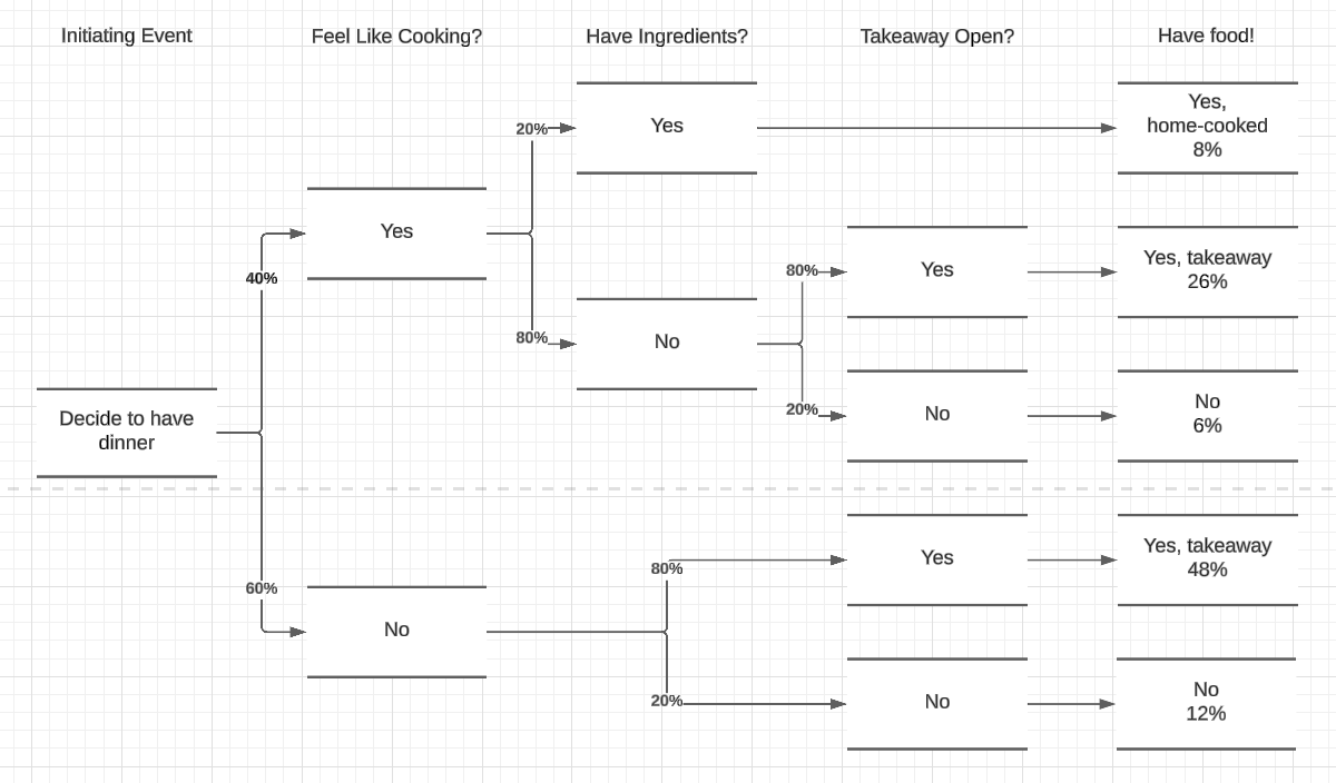 Finally we get to the results of the paths. There may be multiple routes to success, and we can work out the probability of success or failure overall using this approach. It also allows us to quickly spot which areas we could improve to change the changes of success - for example making sure groceries were available would make home-cooked food much more likely.